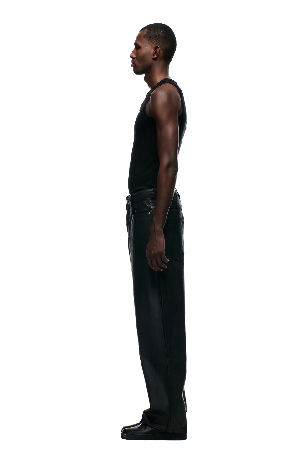Classic coated wide denim with metal 6PM buttons and tonal leather badge.